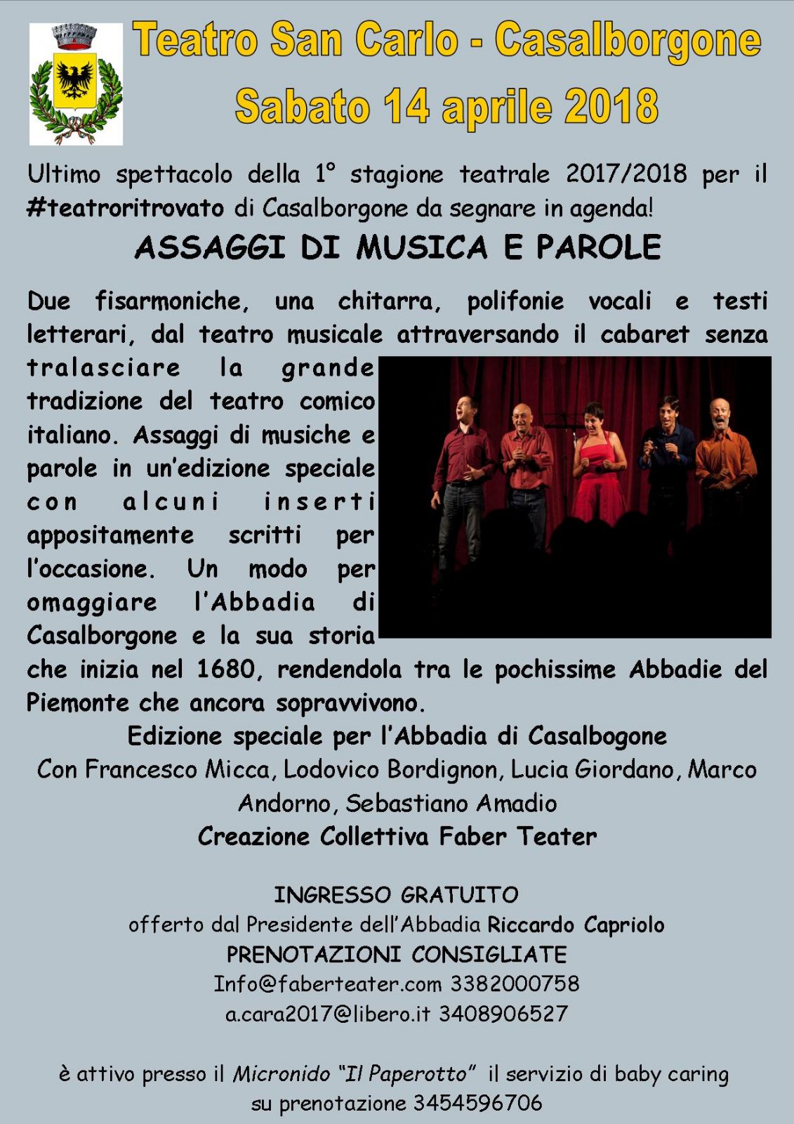 Il 14 aprile si conclude la Prima Rassegna teatrale del Teatro San Carlo di Casalborgone con lo spettacolo “ASSAGGI DI MUSICA E PAROLE” del Faber Teater.