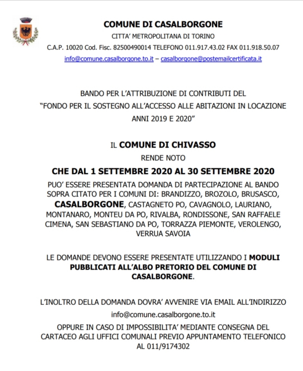 Bando per l'attribuzione di contributi del "Fondo per il sostegno all'accesso alle abitazioni in locazione - anno 2019 2020"