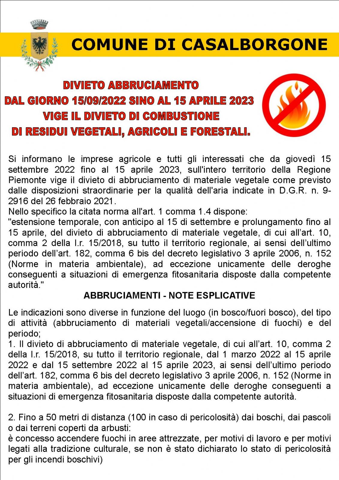 Si informano le imprese agricole e tutti gli interessati che da giovedì 15 settembre 2022 fino al 15 aprile 2023, sull'intero territorio della Regione Piemonte vige il divieto di abbruciamento di materiale vegetale come previsto dalle disposizioni straordinarie per la qualità dell'aria indicate in D.G.R. n. 9-2916 del 26 febbraio 2021.