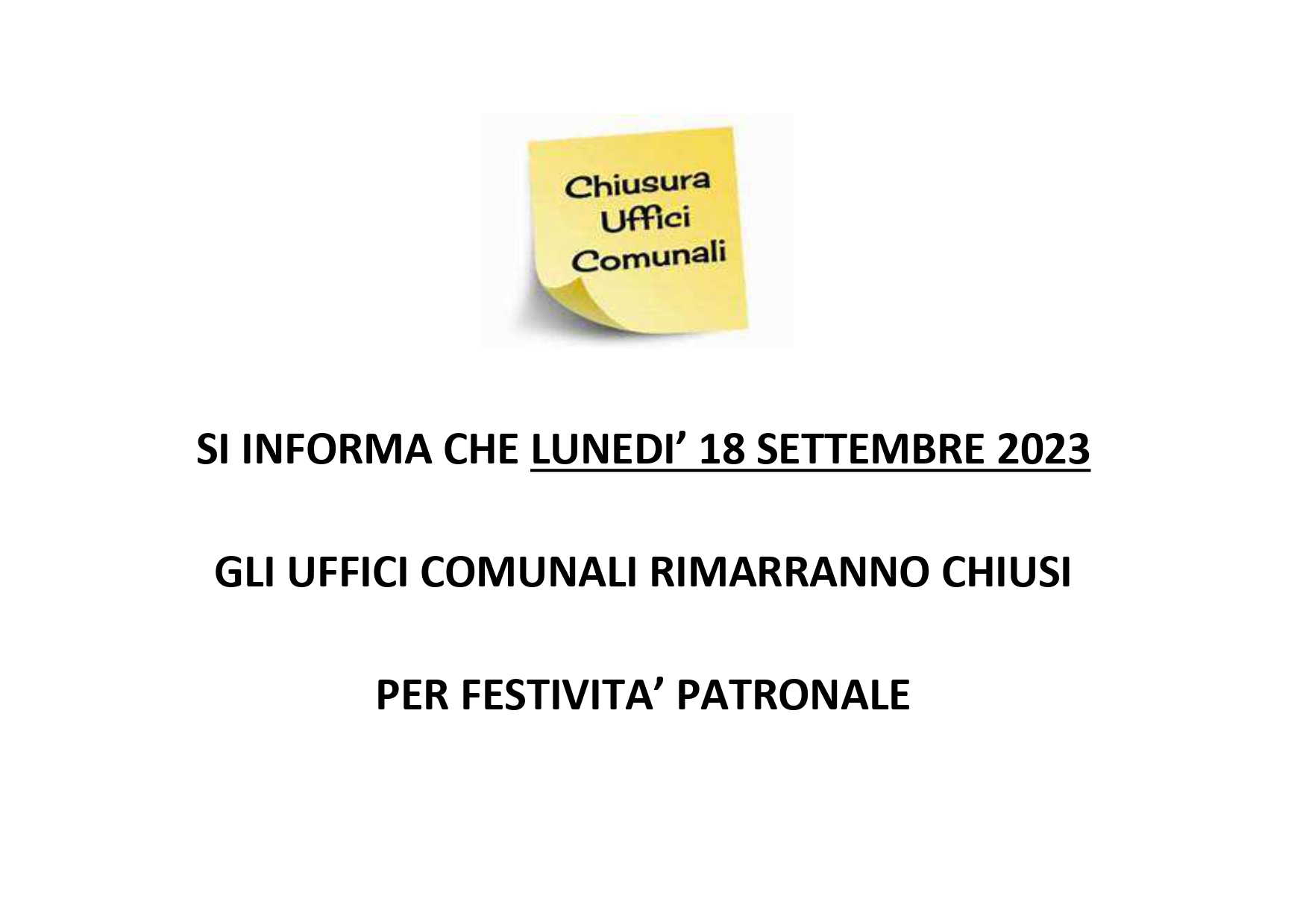 Si informa che lunedì 18 settembre 2023 gli uffici comunali resteranno chiusi per Festa Patronale