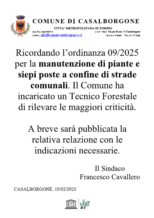 Ricordando l’ordinanza 09/2025 per la manutenzione di piante e siepi poste a confine di strade comunali. Il Comune ha incaricato un Tecnico Forestale di rilevare le maggiori criticità.