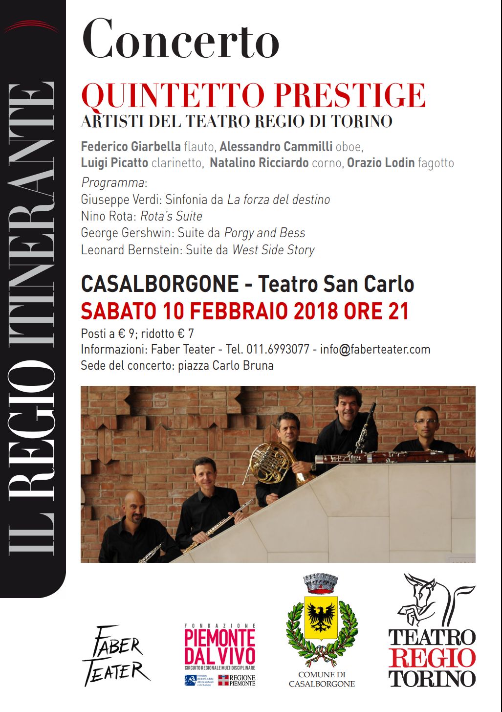 Terzo appuntamento teatrale: sabato 10 febbraio 2018 alle ore 21 presso il Teatro San Carlo di Casalborgone ci sarà un concerto di grande qualità. Saranno ospiti gli Artisti del Teatro Regio che compongono il Quintetto Prestige che ci faranno ascoltare musiche di Prokof'ef, Gershwin e Bernstein.