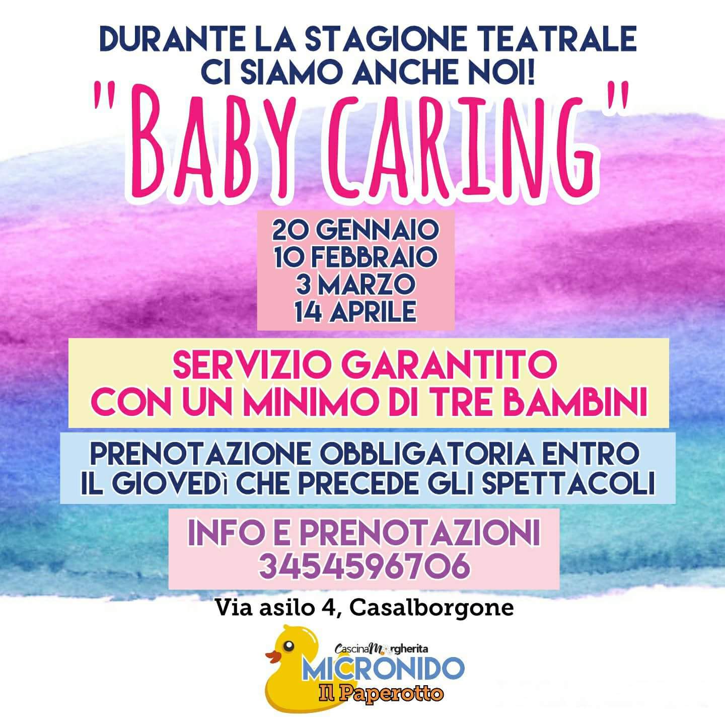 Si ricorda che, con un minimo di tre bambini, è attivo presso il Micronido “Il Paperotto” di Via Asilo - Casalborgone, il servizio di baby parking – su prenotazione n. 3454596706 (entro 3 giorni prima dello spettacolo)