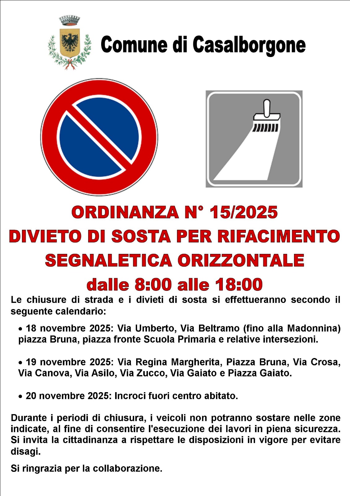 Ordinanza N. 15/2025 - Divieto di sosta per rifacimento segnaletica orizzontale i Giorni 18, 19 e 20 Novembre 2025, dalle ore 8:00 alle ore 18:00